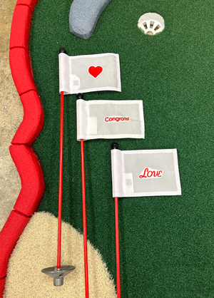 • 9 white flags with a red heart (3), red congrats(3) and red LOVE (3) embroidered on flags on flag sticks set in white buckets (set at the end of hole)